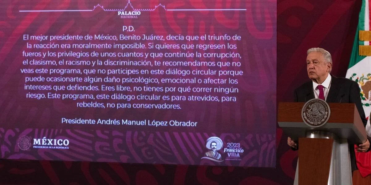 Durante su conferencia matutina en Palacio Nacional, el mandatario federal explicó que la posdata sugería que si alguien tenía un pensamiento conservador o reaccionario, era recomendable no seguir el programa. Aunque mencionó que la advertencia no estaba mal, López Obrador confió en que las personas cambiarán y citó el refrán "de sabios es cambiar de opinión". También enfatizó la importancia de llegar a los jóvenes con su mensaje, ya que considera que tienen una perspectiva fresca y abierta.
