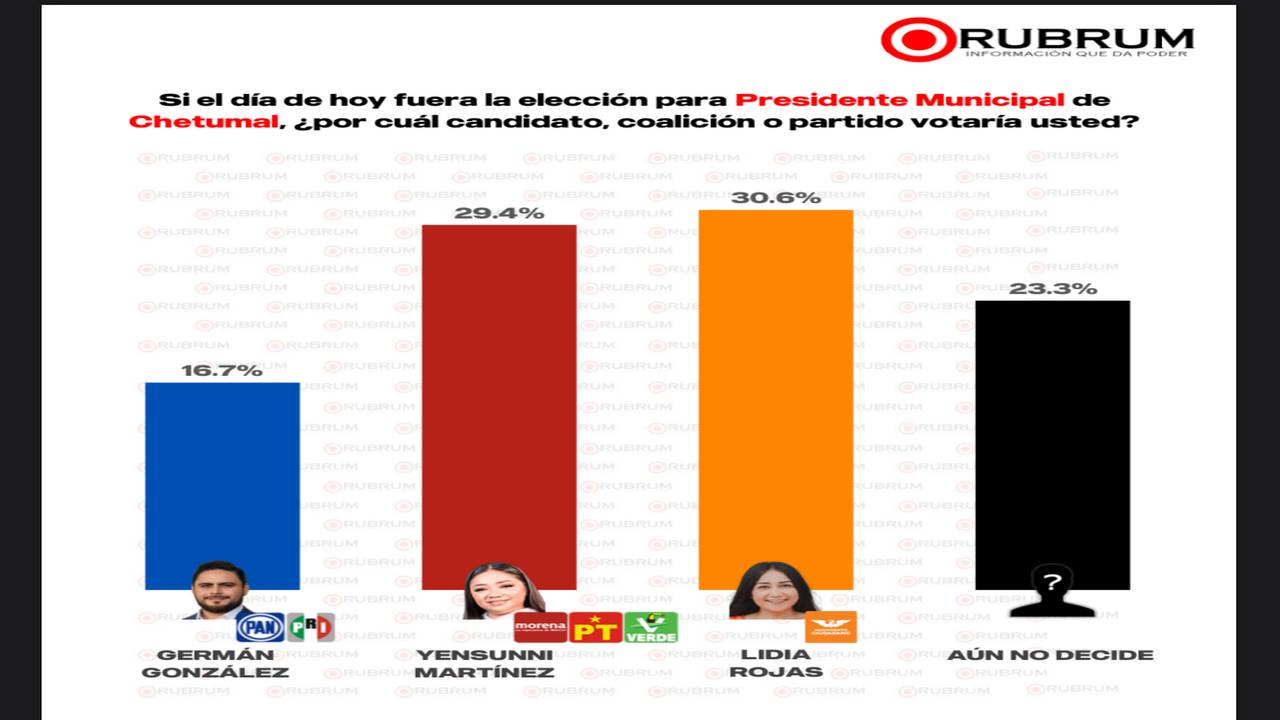 De acuerdo con el estudio endoscópico de Rubrum, Rojas se mantiene a la cabeza con el 30.6 por ciento de las preferencias entre la gente de Othon P. Blanco, seguida de Yensunni Martínez, de Morena-PT-PVEM, quien suma el 29.4 por ciento de apoyo.