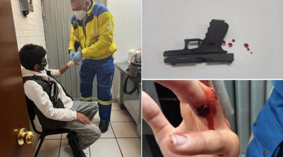 De acuerdo con otros alumnos, el joven se encontraba manipulando el arma de fue y se disparó en el dedo anular de la mano izquierda para posteriormente pedir apoyo de una ambulancia.