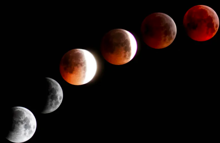 El eclipse lunar total, también conocido como luna de sangre, que se pudo ver este domingo en México y otros países, inició su fase parcial a las 21:28 horas y en solo una hora dio paso a su fase total.