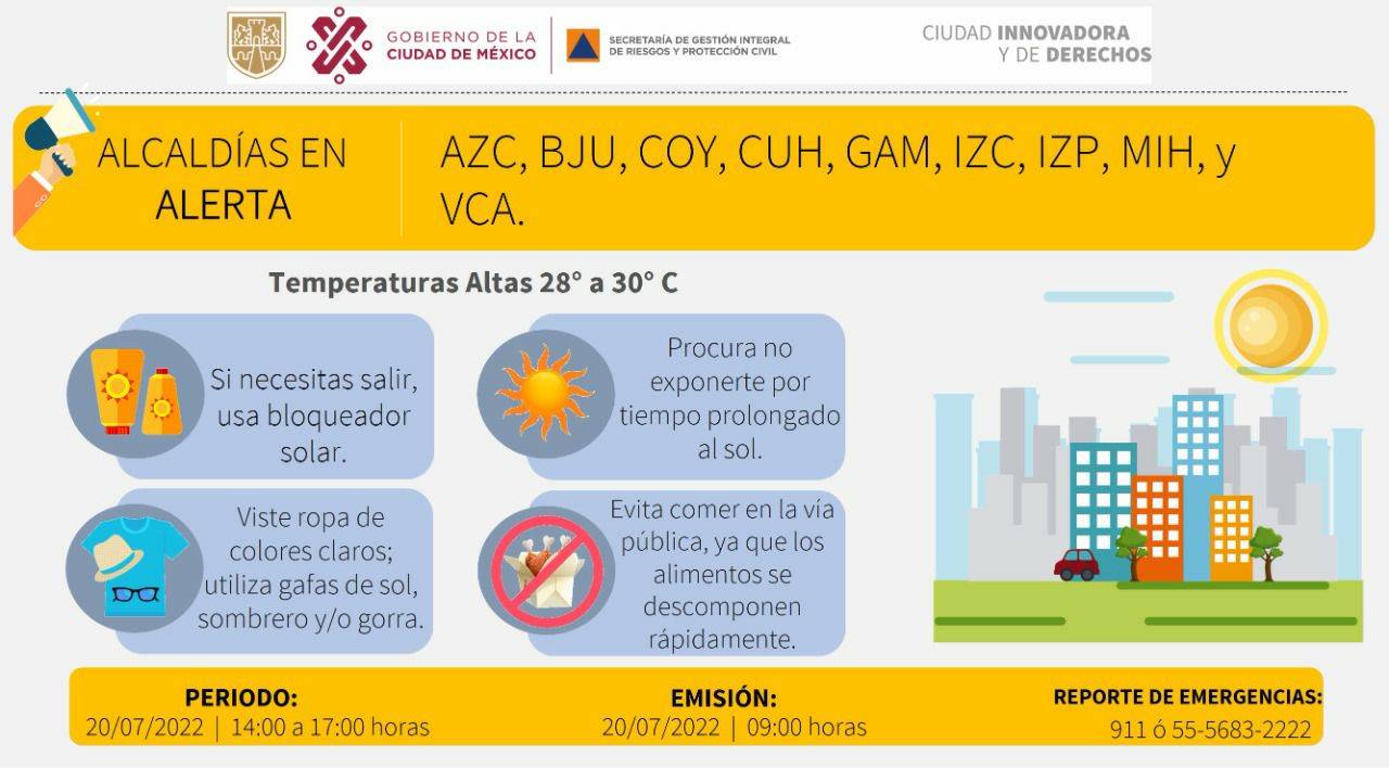 La Secretaría de Gestión Integral de Riesgo y Protección Civil (SEGIRPC) emitió este miércoles 20 de julio, una alerta amarilla en 8 alcaldías de la Ciudad de México debido a que se prevé temperaturas de hasta 30°C.