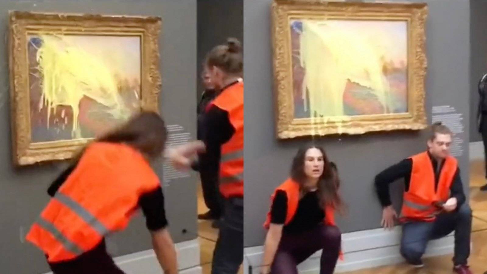 Dos activistas del grupo alemán de protesta por la protección del clima "Última Generación" lanzaron puré de papa a un cuadro del pintor Claude Monet; los hechos ocurrieron este domingo en el Museo Barberini de Potsdam, al sur de Berlín.