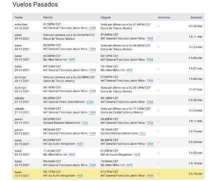 De acuerdo al historial de vuelos del avión con placas XB-JKU del cual tuvimos acceso, se reportan salidas desde el Aeropuerto Internacional General Francisco Javier Mina con destino a Matamoros para acudir a la toma de protesta de su amigo Mario López, actual alcalde de Matamoros.